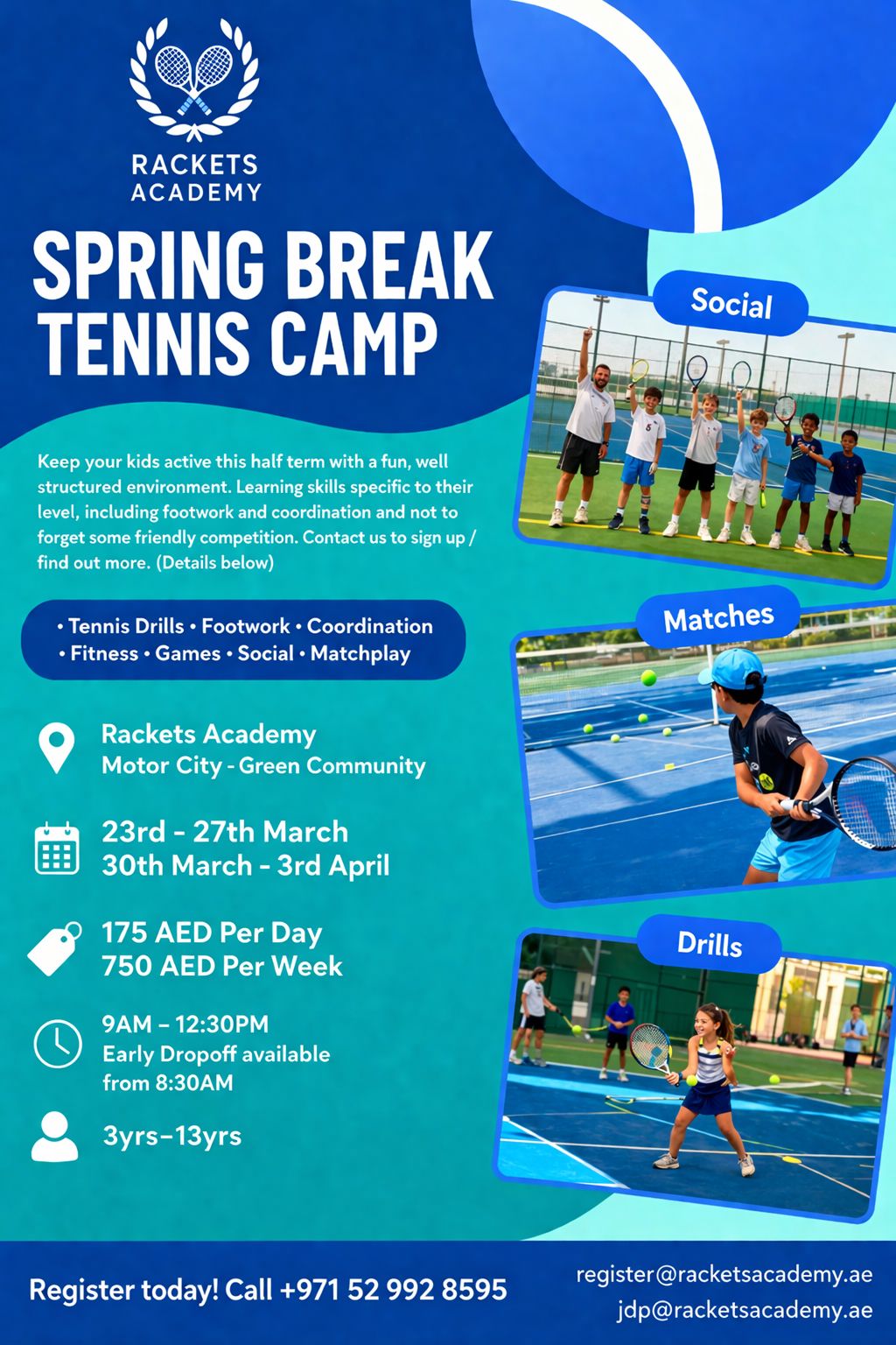 March 9 @ 8:30 am - April 3 @ 12:30 pm Motor City Spring Junior Development Camp Rackets Academy – Al Barsha Al Barsha, Al Barsha, Dubai, United Arab Emirates Age: 4-12 AED750
